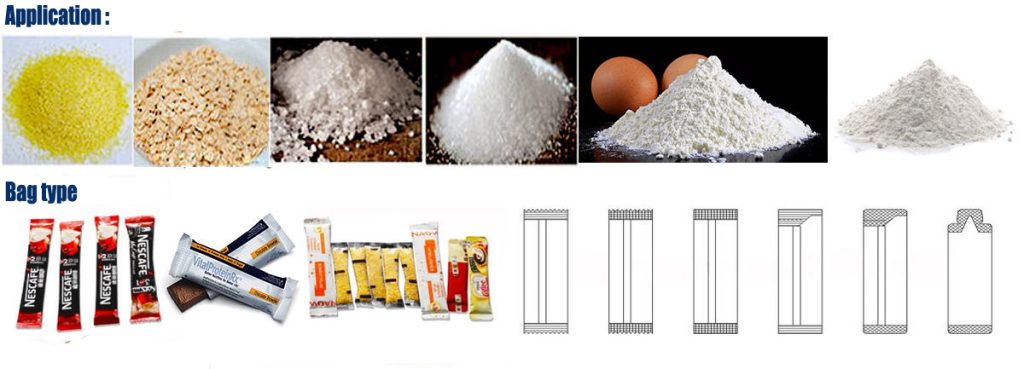 এই মেশিনটি প্রধানত পাউডার পণ্যগুলি প্যাক করার জন্য ব্যবহৃত হয়: যেমন দুধের পাউডার, দুধ চা পাউডার, কফি পাউডার, মশলা, কারি পাউডার, প্রোটিন পাউডার, কনডেন্ট, ভেষজ গুঁড়া, রাসায়নিক ও চিকিৎসা পাউডার পণ্য।